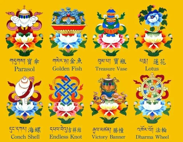 “佛教八寶”亦稱“吉祥八寶”或“八吉祥”或“八瑞相”等,即“輪螺傘蓋花罐魚長(zhǎng)”,展開來就是法輪、法螺、寶傘、白蓋、蓮花、寶瓶(罐)、金魚(雙魚)、盤長(zhǎng)(吉祥結(jié))。