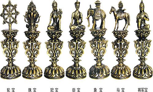 7.將軍寶:又稱兵寶、武士寶。為一持兵器的武士形像,表示護(hù)持佛法、克服困難、戰(zhàn)勝敵人。