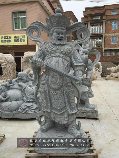 石雕四大天王采用優(yōu)等石材精雕細(xì)琢而成。整尊雕像身軀魁偉,氣勢(shì)威武,兩腿以半弓步橫跨在流云上,顯示出叱咤風(fēng)云,拔山蓋世的英雄氣概。