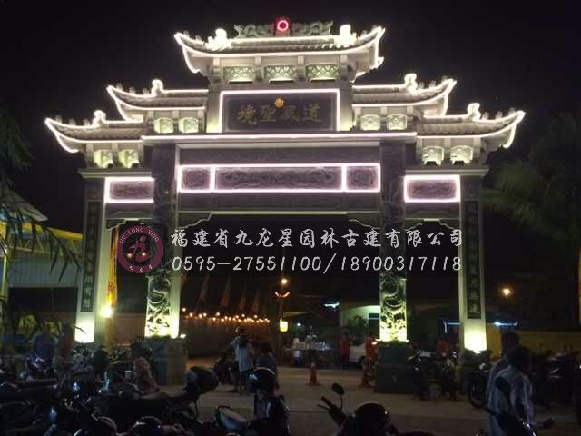 石雕牌坊的造型大氣美觀,結(jié)構(gòu)合理勻稱(chēng),周身雕刻著各種吉祥圖案,代表著我國(guó)的傳統(tǒng)文化,各種吉祥物也反映出人們對(duì)于美好生活的向往。石雕牌坊按照開(kāi)門(mén)數(shù)一般可分為三門(mén)、五門(mén)、七門(mén)。草白玉、青石、漢白玉以及花崗巖這些石材成為制作石雕牌坊的主要石材。牌坊周身布滿(mǎn)浮雕圖 案,雕刻工藝精美細(xì)膩。常見(jiàn)的瑞獸圖案有龍、鳳、麒麟、鹿(諧“祿”)、魚(yú)(諧“余”)等。另外有荷花、牡丹、松鶴、梅蘭竹菊代表著健康長(zhǎng)壽、平安幸福。 石雕牌坊頂部的結(jié)構(gòu)造型主要有坊式和樓式兩種,樓式結(jié)構(gòu)的頂部結(jié)構(gòu)復(fù)雜,斗拱以及樓瓦的配合使得整體氣勢(shì)恢宏。